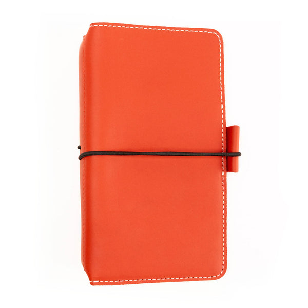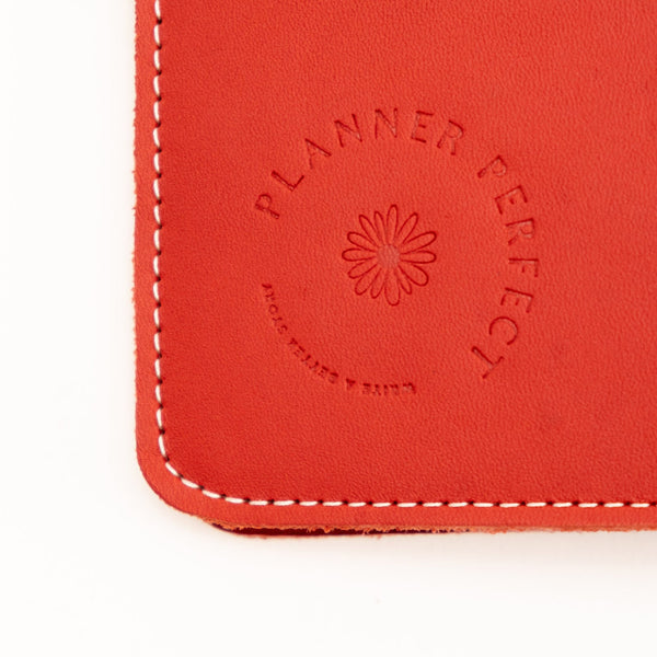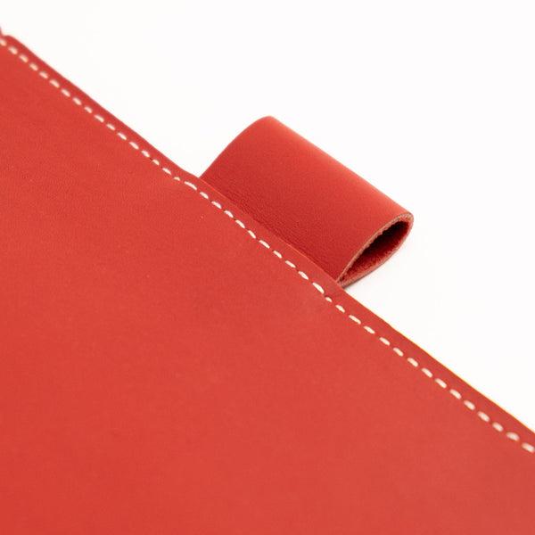 The Ruby Everyday Organized Leather Traveler's Notebook features our bright red colored full grain American leather which has a matte appearance and soft leather grain feel. Constructed with two layers of leather and finished with white contrasting stitching.