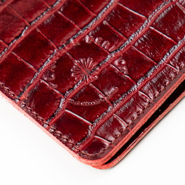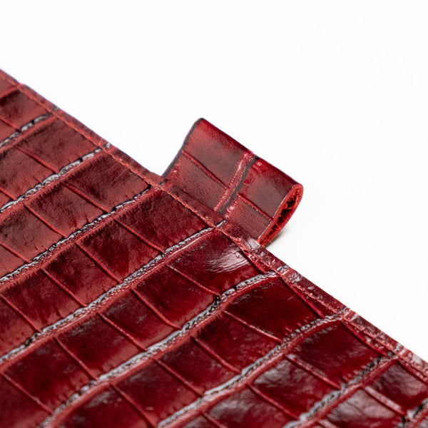 The Cabernet Everyday Organized Leather Traveler's Notebook features our Cabernet red croc embossed full grain American leather. Constructed with two layers of leather and finished with white stitching.