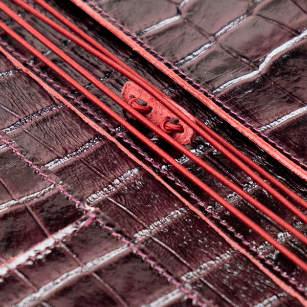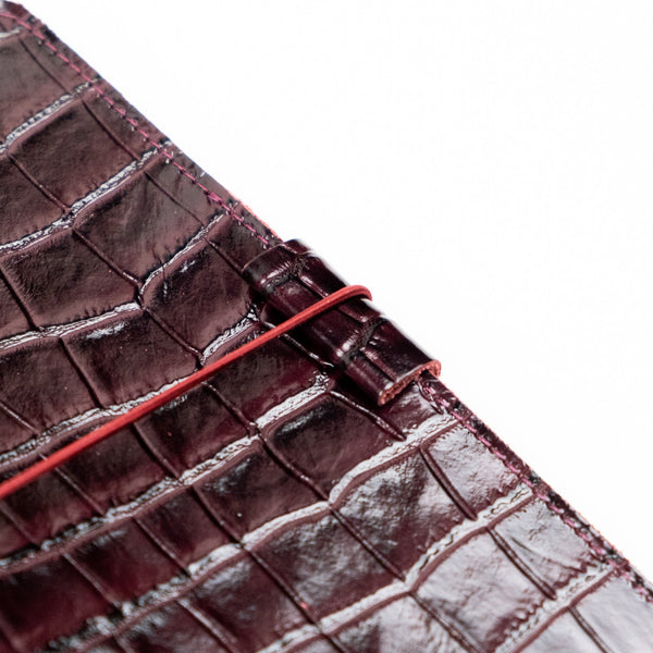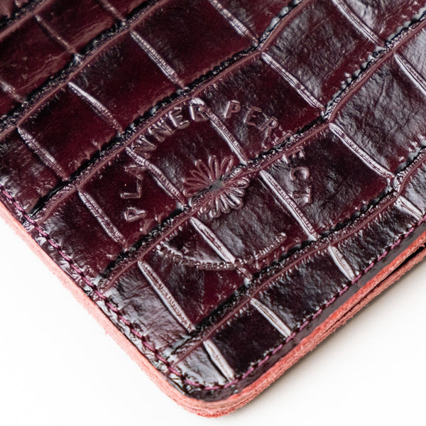 The Bordeaux Everyday Organized Leather Traveler's Notebook features our Bordeaux purple croc embossed full grain American leather. Constructed with two layers of leather and finished with white stitching.