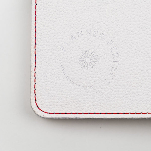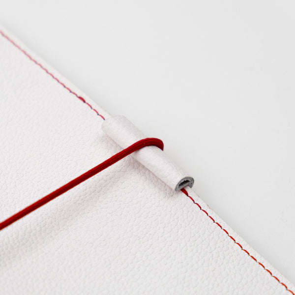 The Gwen Everyday Organized Leather Traveler's Notebook features our pebbled style white colored full grain American leather which has a matte appearance and soft pebbled leather grain feel.  Grain and texture varies with each piece.  Constructed with two layers of leather and finished with red contrasting stitching and red elastics.