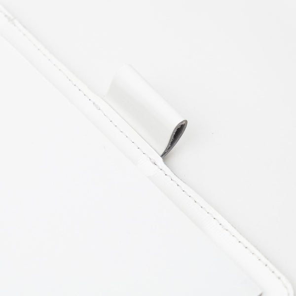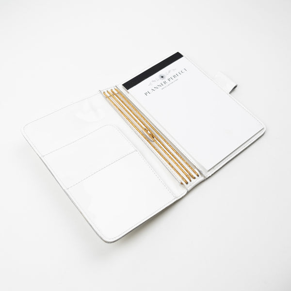 The Luna Everyday Organized Leather Traveler's Notebook features our white colored full grain patent American leather which has a gloss appearance and smooth feel.  Constructed with two layers of leather and finished with complimenting white stitching, white zipper, and gold elastics.  Very durable and uniform texture.  Grain and texture varies with each piece.