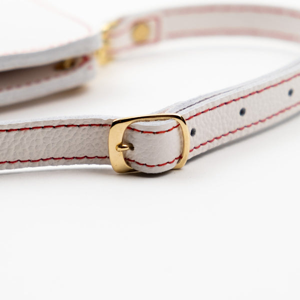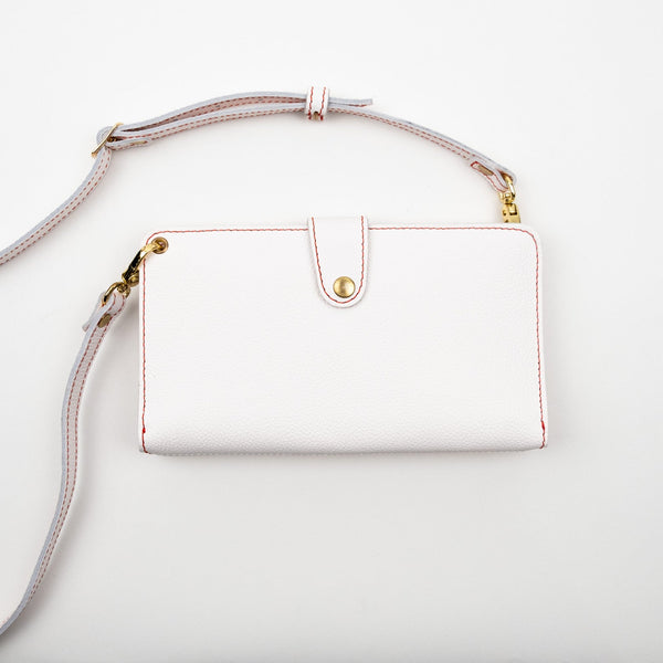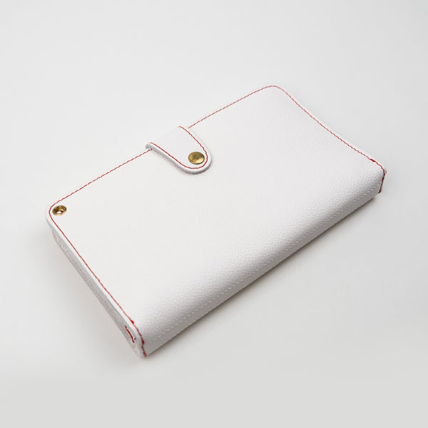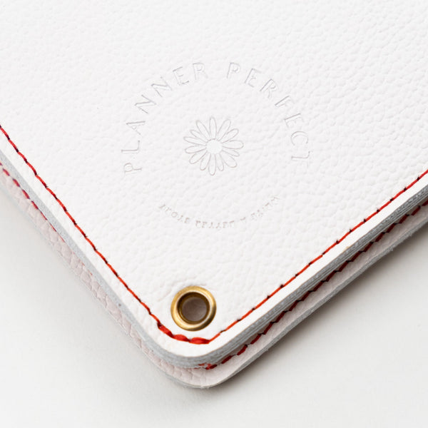 The Gwen Everyday Traveler's Notebook Wallet features our pebbled style white colored full grain American leather which has a matte appearance and soft pebbled leather grain feel.  Grain and texture varies with each piece. Finished with red contrasting stitching and red elastics