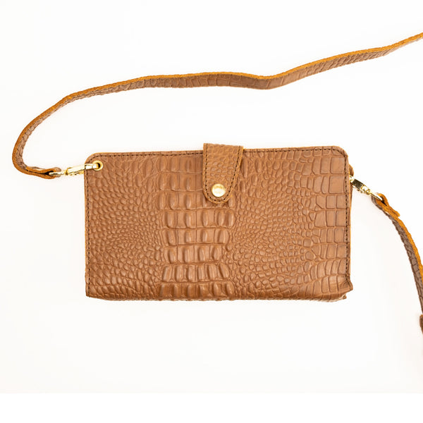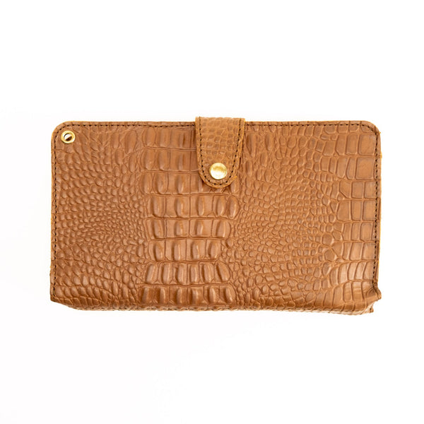The Yazzabelle Everyday Traveler's Notebook Wallet features our croc textured leather in a rich, multi-toned caramel to dark coffee brown, full grain American leather which has a slightly satin appearance. Very durable, yet soft, and will show minimal marks and wear over time. Grain and texture varies with each piece.