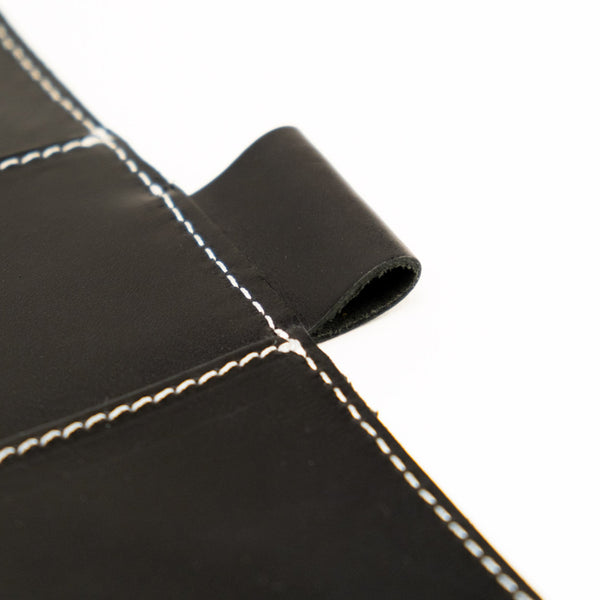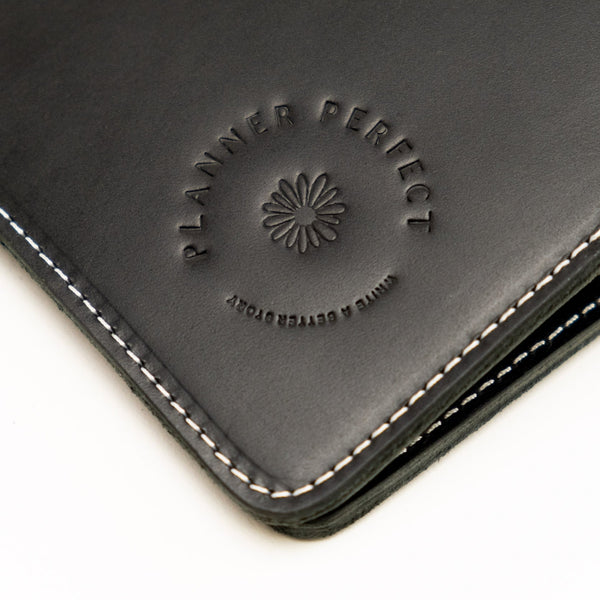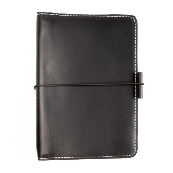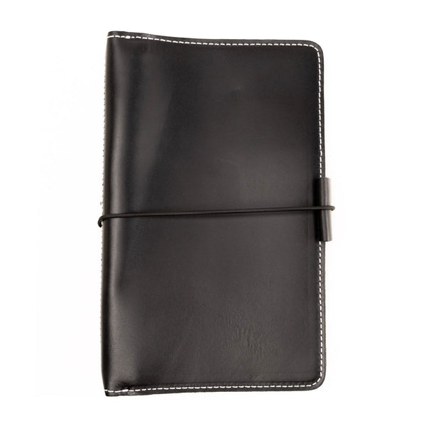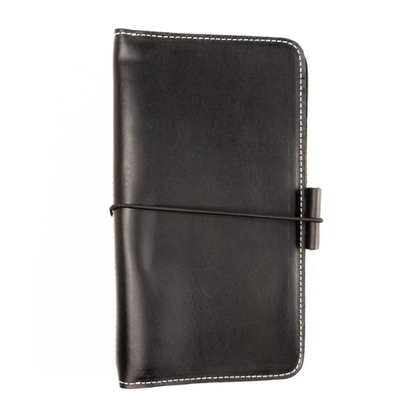 The Sofia Out and Organized  Leather Traveler's Notebook features our rich, black, full grain, American leather which has a glossy appearance and smooth feel.  Very durable, smooth feel, and uniform texture.  Grain and texture varies with each piece.  Constructed with two layers of leather and finished with contrasting white stitching, black zipper, and black elastics.  Very durable, soft feel, and uniform texture.  Grain and texture varies with each piece.