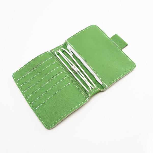 The Daphne Errand Runner Leather Traveler's Notebook features our pebbled style green colored full grain American leather which has a matte appearance and soft pebbled leather grain feel.  Grain and texture varies with each piece.  Constructed with white contrasting stitching and white elastics.