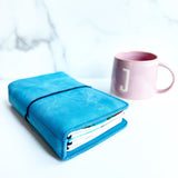 The Azura Out and About Traveler's Notebook features features our smooth typhoon blue variegated toned, medium blue leather, in in a rich full grain American leather which has a satin appearance smooth feel. Very durable, created with double layers of leather, and will show minimal marks and wear over time. Grain, color, and texture varies with each piece.