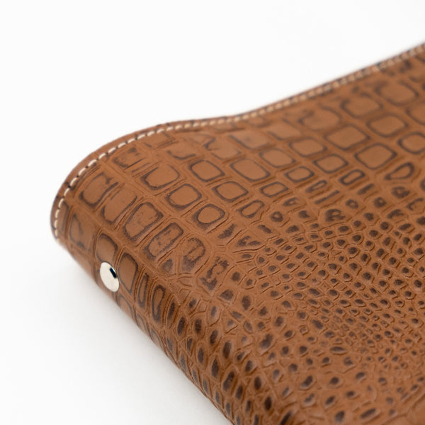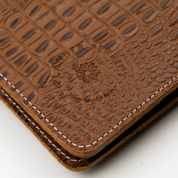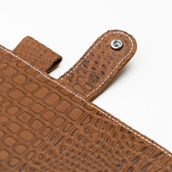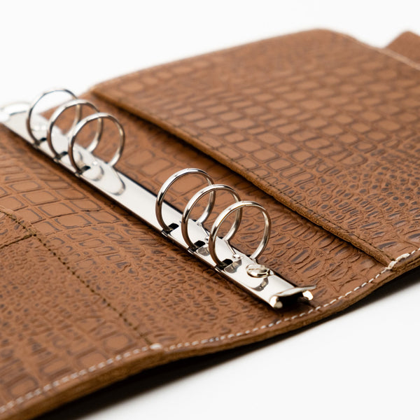 The Yazzabelle A5 6-Ring Leather Binder features our heritage croc leather in brown. Grain and texture varies with each piece. Constructed with two layers of leather and finished with matching stitching.